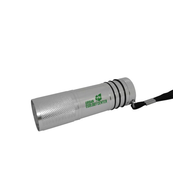 LED Aluminum Flashlight with 9 super bright and powerful white LED light bulbs. On-Off push button, wrist lanyards and 3 AAA batteries are included. This flashlight includes a black nylon carry wrist strap attached at the base.